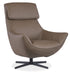 Contemporary, casual and chic, the upholstered Hughes Swivel Chair has a swanky silhouette featuring a bustle-style back, metal swivel base, flared arms and the top-grain semi-aniline Sonnet Dust leather cover.
