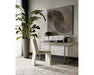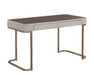 This contemporary desk is defined by its beautiful and gentle curves. Upholstered in cream faux leather with a brown oak veneer tabletop that is sure to impress. Includes two drawers and completed with a rustic bronze steel base. Coordinating console table, media console and cabinet and sideboard also available. Handle With Care: This design has been crafted with faux leather. Faux leather is manufactured to reflect the natural characteristics of leather; as such, colour variations, markings wrinkles, grooves, and light scratches are appreciated characteristics. No two pieces will be alike. Visit our Product Care page for more information on how to ensure the lasting beauty of this piece.