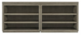 With a rustic weathered smoked Mink gray finish and clean modern lines, the Linville Falls Credenza has a 72-inch top and two open desk cabinets with a total of 4 adjustable shelves. Fully finished on the back, the credenza can be floated in a room.