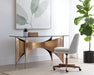 This glamorous desk combines modern geometric design with a classic style to enhance any office space. Smooth 12mm smoked tempered glass sits atop a powder coated antique gold stainless steel base to provide an elegant contrast. Complete the look with other items from our London collection.