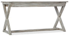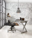 With its light gray casual finish, X-base and stretcher, the Dixon Writing Desk would be at home in a light-infused loft or cottage studio office. The chic modern desk has 3 drawers, including two utility drawers with a removable writing insert that can be used in either drawer and a center drawer with drop-front for keyboard use. Crafted of Oak Veneers and accented with simulated leather.