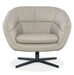 Brimming with modern energy and an inviting style, the Mina Swivel Chair features a contemporary twist on the classic barrel-back chair, along with a low channeled back and sloped arms. It is upholstered in the semi-aniline top-grain Buckskin Beige leather and has a metal base.