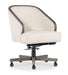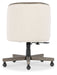 Discover the Paloma Executive Swivel Tilt Chair in the timeless Mink finish, designed by Hooker Upholstery for contemporary home office spaces. Featuring a barrel back design with wire-brush detailing in dark, earthy tones, this chair exudes a classic aesthetic. Upholstered in Inverness Natural fabric with easy-care properties, it offers adjustable height, swivel motion, and a sturdy dark wood trim and base. Ideal for professionals seeking comfort and style in their home workspace setup.