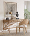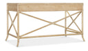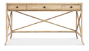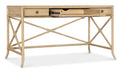 With the sublime vibe of an island oasis, the Retreat Writing Desk is crafted of Oak and Maple Veneers in a Bamboo motif and accented by rope. X-design stretchers on the back and sides distinguish the piece, along with the sand-colored Dune finish, transparent by design to showcase the unique patterns of the wood veneer. Featuring three drawers, the left and right drawers have two removable dividers. One pencil tray and one writing slide may be used on either side, and the center drawer has a drop-front for keyboard use. Finished on all sides.