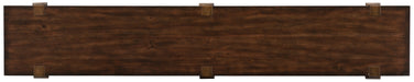 Create a refined rustic ambiance with this stylish mixed media console combining Acacia Veneers, metal sheet and resin in a dark wood distressed finish for authenticity. At only 15 ½ inches deep, this console packs a punch even in small spaces. One fixed shelf.
