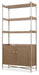 A stylistically versatile piece blending natural textures with a light-and-airy modern aesthetic, the Sonnet Bookcase is ideal for storage and display or as a room divider. Crafted of Quartered and Cathedral-Cut White Oak Veneers in a light earthen-toned finish, it has complementary woven cane door fronts. Chic satin-finished metal knobs accentuate the metal frame and the slender, tapered legs and X-stretcher. The two fixed wood shelves have gallery backs. The two wood-framed doors have cane fronts, soft-close hinges and one adjustable wood shelf behind the doors.