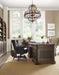 Character emanates from this expansive desk. A two-tone finish combines a saddle brown with an aged black accent finish. Custom-crafted pewter hardware with shaped back plates is inspired by hand-wrought ironworks from Texas Hill Country. Packed with function, the St. Hedwig desk offers a drop-down keyboard drawer, removable mouse pad, pencil tray and dividers and letter/legal files on the left side front drawer. Seven drawers total.