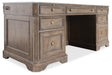 Traditional with a twist, the Sutter Junior Executive Desk is crafted of Cathedral Oak Veneers with a classic silhouette and a casual clear Oak finish with champagne-colored pulls and knobs. Featuring 7 drawers, the top left and right drawers are on full extension metal ball bearing slides with removable divider inserts and one removable pencil drop-in that can be used on either side. Bottom drawers are locking file drawers with pendalfex filing system and full extension metal ball bearing slides. Center drop-front drawer for keyboard use. Two pullout writing slides on left and right. Finished on all sides.