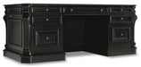 With a hunt country flair and pedigreed design details like a bonded leather top, carved scroll motif accents, and carved leather panel insets on the front of the case with nail head trim, the Telluride Executive Desk makes work an adventure. Crafted of Cherry Veneers with Carved Leather with a black paint finish and reddish brown rub-through, the desk includes 7 drawers on steel ball bearing slides and two file drawers and a center drawer with drop-front for use with a keyboard and two pullout writing slides. A pencil tray can be used left or right, with dividers in the middle drawer.