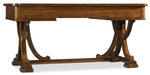 With a rustic equestrian flavor, The Tynecastle Writing Desk has a criss-crossed beam-like base reminiscent of rafters in a barn, elevated by chunky feet. Crafted of Poplar Solids and Figured Alder Veneers, the desk is finished in a warm chestnut color. A center drawer with drop-front allows for keyboard use. Two utility drawers with 3 slots and 2 removable dividers in each drawer. One writing slide and one pencil tray for use in either drawer.