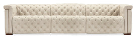 The Savion Deux 3 Seat Sofa offers two power recliners and three power headrests for personalized comfort, all wrapped in the soft Aries Beach performance fabric. This durable fabric, combined with dark wood accents and classic chesterfield tufting, gives the sofa a sophisticated yet versatile appearance. Copper-toned nail trim adds a touch of elegance, while the discreet power recline mechanism ensures luxurious seating for any living room.