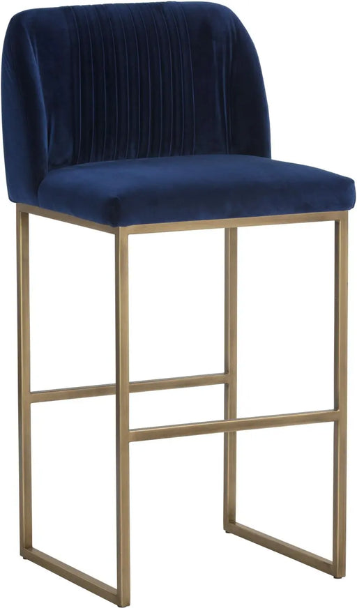 A modern barstool from that offers style and comfort. Features delicate ruching on the rounded seatback and exposed antique brass legs. Stocked in ...