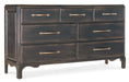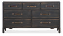 In a classic, charming design with a nostalgic flair, the American Dresser is crafted of Oak Veneers with a Solid-Wood Edge Top, a scalloped-shape base and finished in the deep, dark Molasses finish. There are 7 self-closing drawers, with the top left and right drawers with black removable felt liners. The center drawer has a black liner and black removable jewelry tray. The bottom two drawers are cedar-lined. Metal alloy pulls are in an antique bronze finish.