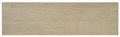 - Finish: Terrain: a soft, taupe finish on oak veneers. Distressing includes dry brushing. Champagne colored bar pull hardware and metal base.