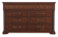 The tropical craftsmanship and botanical carving of the West Indies meets southern charm with the Charleston Nine-Drawer Dresser. Crafted of Cherry Veneers, Cane and Resin, the top three drawers have cane insets on the drawer fronts and removable felt liners inside. Front posts on either side have leaf motif carving. The center top drawer has a removable felt jewelry tray and the bottom two drawers are cedar-lined. The dresser is finished in Maraschino Cherry using natural grain Cherry Veneers showcasing a dramatic cathedral structure with naturally occurring knots to deliver a rich warm finish and a smooth sophisticated aesthetic. The round knob and bar pull hardware is finished in an antique bronze.