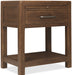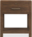 The Driftwood One-Drawer Nightstand in Worn Saddle, a rich burnished brown finish, offers versatile storage with a self-closing drawer, pull-out shelf, and fixed lower shelf. The cord clip helps keep cords tidy and accessible.