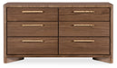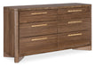The Eleana Dresser exudes timeless sophistication with its Light Caramel walnut veneer finish and plated Sunlit Bronze hardware. Designed with six self-closing drawers, a jewelry tray, and cedar-lined bottom drawers, it offers elegant organization. Soft, rounded corners enhance its sculptural silhouette, making it a standout piece for transitional bedrooms.
