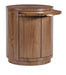 The Eleana Round Nightstand features a beautiful starburst veneer top, touch-latch wood doors, and a pull-out tray for added versatility. Finished in Light Caramel walnut veneers with Sunlit Bronze hardware, this piece is perfect for adding warmth and luxury to any bedroom.