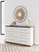 Looking to make a subtly striking statement in your bedroom? We've got you covered. This dresser's sophisticated two-tone treatment marries a warm finish over replicated walnut grain with a matte white finish. Rounded corners and a thick top radiate an air of modern panache, while sleek handles in a champagne finish add a sparkling touch to the spacious drawers. It’s a master class in contemporary yet comfortable character.