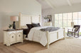 Reimagining a well-loved historical silhouette with a fresh take on finish, function and form, the inviting Americana California King Panel Bed has a planked motif on the headboard and footboard, scroll-work on the base of the footboard and caps on the bedposts. Crafted of Oak Veneers, it is finished in the timeworn white Daisy representing the natural wear one might expect of pieces passed down through the family over time. Headboard can be used alone.
