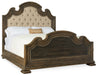 This stunning button-tufted upholstered king bed with an elaborately carved and shaped head and footboard imparts an authentic American character. The rich two-tone finish combines an aged black, used in the middle of the generously-scaled footboard, while the timeworn saddle brown finish is used on the carved headboard and the carved border of the footboard.