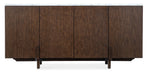Rich, dark figured walnut veneers are accented by a Volakas Marble top in white, gray, cream and beige colors to create a striking and timeless piece with functional appeal. The four doors with soft close hinges have touch latches, and the left door has one adjustable wood shelf and one pull-out tray. The center pair of doors have one drawer and one adjustable/reversible wood shelf with wine option holding up to 10 bottles. The right doors with one file drawer accommodate letter or legal documents. Ventilated back panel and wire management. Gold-colored square knobs add an updated touch.