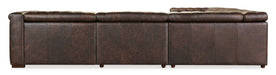 The Savion Deux 5 Seat Sectional with three power recliners and six power headrests is upholstered in luxurious West Saddlewood Top Grain leather. This sectional features classic chesterfield tufting, copper-toned nail trim, and dark wood accents for a seamless blend of sophistication and comfort. With power reclining seats at each end and one armless seat, it’s the perfect centerpiece for a large living room.