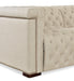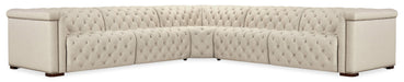 Featuring three power recliners and six power headrests, the Savion Deux 5 Seat Sectional in Aries Beach performance fabric delivers a perfect balance of comfort and style. With dark wood accents, classic chesterfield tufting, and copper-toned nail trim, this sectional is designed for versatility and durability. The seamless reclining function ensures a luxurious seating experience, making it ideal for modern living spaces.