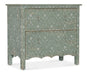 In a classic, charming design with a nostalgic flair, the Americana Two-Drawer Accent Chest has a scalloped-bottom shape and is finished in a soft Antique Green with distressing and rub-through over Oak Veneers. A white scroll pattern covers the exterior, and the interior has a Honey finish. Metal alloy tear-drop pulls in an antique pewter finish have white hang-up accent. Two self-closing drawers.