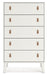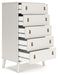 Dare to take minimalism to the max. This chest of drawers has an air of sleek simplicity thanks to its painted finish with subtle replicated wood grain. Magnificently mod splay legs are a compelling complement to the streamlined design. And with two sets of faux leather drawer pulls that allow you to customize the chest to suit your space, there's no doubt about it: This contemporary piece is sure to become a classic.