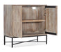 Offering a casual modern rustic design with a tribal flair, the Commerce & Market Two-Door Chest is crafted of Mango Solids and Iron with carved front doors with diamond motifs, There’s one adjustable wood shelf behind the doors and a metal base.