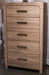 The natural wood tones and clean lines of this chest of drawers echo your easygoing style sensibilities. With a warm finish and replicated oak grain, its carefree character lightens up your bedroom. Curved inner corner details soften the look, while sleek bronze-tone hardware modernizes the feel.