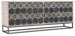 An abstract art pattern created with bone inlay in a black, white and gray color scheme makes the Whitmore Credenza a one-of-a-kind artistic accent. Crafted in Mango Wood, the four-door credenza has a removable shelf behind each pair of doors, a ventilated back panel and wire management.