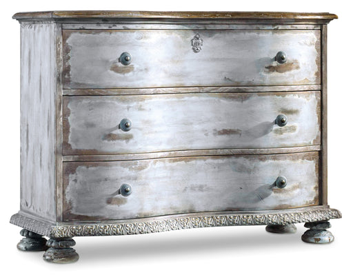 Majestic, graceful and distinctive, the Charleston Three-Drawer Accent Chest has a serpentine-shaped front, handpainted accents on the shaped botto...