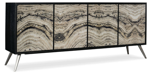 With stunning geode-patterned reverse painted glass doors in a black and ivory pattern, accented by silver metal legs, the Rockee Four-Door Credenz...