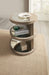 Symmetry and style come together in the Affinity Round Table, featuring three shelves with glass inserts in tapering sizes and a tactile greige sand-blasted finish on Quartered Oak Veneers. The top shelf is 18 ½ wide, the middle shelf is 20 inches wide, and the lower shelf is 22 inches wide.