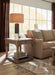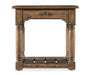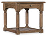 In a classic and clean design with a nostalgic flair, the 26W x 30D rectangle-shaped Americana End Table has turned carved legs, scroll accents in the corners and a planked bottom fixed shelf with an interlocked design that exudes craftsmanship. Made of Oak Veneers with a Solid-Wood Edge Top, it is finished in Honey, a gentle, warm brown tone with distressing that hints at the passage of time, while the smooth surface invites you to run your fingers across it, connecting you with past generations. A metal alloy oval pull in an antique bronze finish adds a final touch.