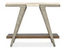 - Finish: Cream colored travertine marble top with natural medium wood finish on shelf and gray metal frame