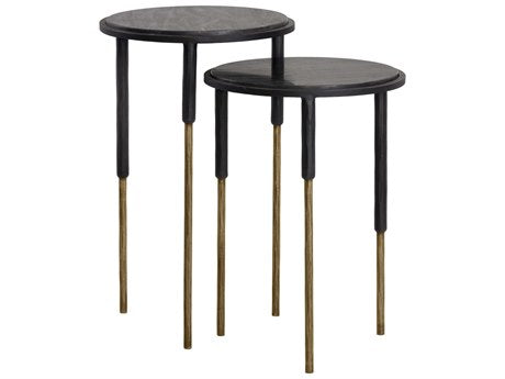 A surreal set of nesting side tables crafted in India. Each table features a dramatic black marble top and hand finished black iron and antique bra...
