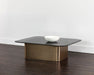 Bring boldness to any space with this eye-catching coffee table. Crafted with a rectangular stainless steel base in an antique brass finish. Completed with a grey glass top for a contemporary look.