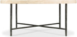 This round cocktail table pairs a textured metal base with an X-stretcher and a stone top for a look that’s both industrial and elegant. The stone surface adds natural variation and durability, making it a centerpiece that’s as functional as it is striking.