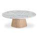 The Evelyn coffee table is a harmonious contrast of materiality and tactility, where a weighty base meets a visually light marble top. With five connected sides equipped with softened, rounded edges, the base assumes an organic appearance, its natural color subtly softening the marble top for enduring visual appeal.