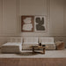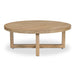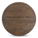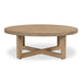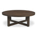 Crafted from solid oak, the Joel coffee table's thick round top features a thoughtfully crafted V-groove, adding a visual lightness to the substantial surface. The geometric base, with crisscrossing stretchers, grounds the piece with quiet confidence. A dark brown, wire-brushed finish enhances the oak's natural beauty, creating a focal point of understated elegance.