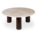 The Landon coffee table encapsulates design and proportion, crafted with a generous 30mm-thick Turkish travertine tabletop and a mango wood base stained in a rich, dark hue. The rounded tabletop edge gives the travertine a soft feeling, while the darkly stained mango wood base adds warmth to the hardened material. Note that no two tables are alike, showcasing their own color and veining variation.