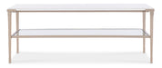 Elevate your living room with the sophisticated Jen Cocktail Table from the Melange collection. Featuring a rectangular white stone top, slim champagne metal legs, and a lower glass shelf, this cocktail table combines style and utility. The open design and refined materials make it an ideal centerpiece for transitional or contemporary spaces, perfect for hosting or displaying decor.