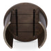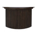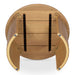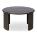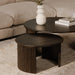 The Penny coffee table's nesting design showcases a circular tabletop with a refined bullnose edge set upon two curved bases adorned with playful, fluted detailing. These solid oak tables infuse dynamic visual interest with the smaller table designed to nest perfectly under the larger one--a harmonious blend of rustic charm and contemporary elegance.