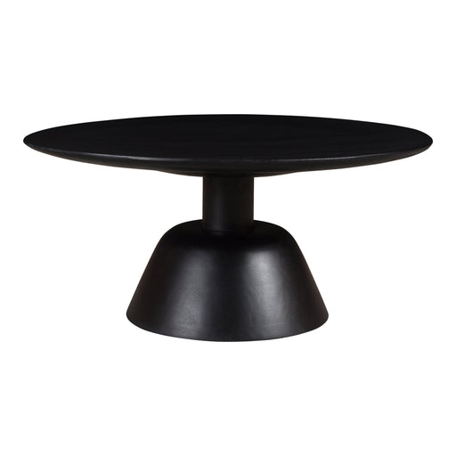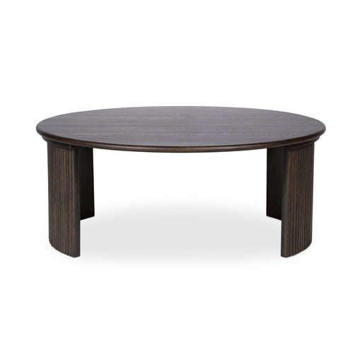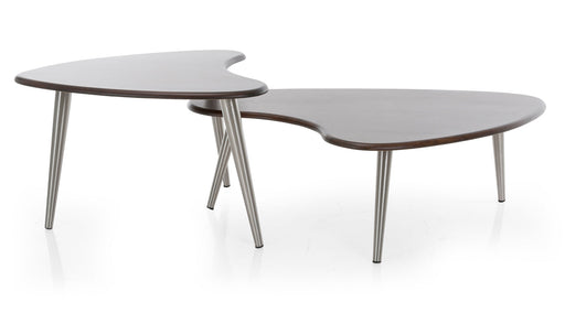 The Penny coffee table's nesting design showcases a circular tabletop with a refined bullnose edge set upon two curved bases adorned with playful, ...
