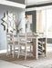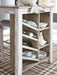 Made with Acacia veneers and select rubberwood solids, in a grayish white finish with rub through effect for a time worn appearance. Top is finished in a medium toned brown color with a planked effect with saw kerf distressing. Chair has a classic casual design with a tall ladder back look with simple features. Seat is covered in a light colored fabric cover. D394-32 pairs with 4 counter height stools. Built-in 8-bottle wine rack and open shelves. D394-024 cushioned saddle seat with a light textural polyester fabric. D394-113 barstool dimensions: 21"W x16"D x 24"H. D394-223 barstool dimensions: 16"W x 14" x 24"H. Multi functional dining table features two convenient side drawers and a storage bin on each end for maximum use of space. Storage on the ends for maximum use of space. Finished in a trend right gray washed color with contrasting light oak colored top. Solid wood chair frames with cushioned seat in light gray woven polyester fabric. Piano style bench with under seat storage bin.