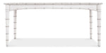 Capturing the vintage charm of the coastal South and the tropical craftsmanship of the West Indies, the Charleston Rectangle Dining Table has bamboo-motif accents and slender bamboo-style legs. The wood table has a Solid Wood Edge Top and is finished in White Heron, a softer interpretation of the classic Southern limestone white with a slightly brighter sheen, delivering an heirloom-quality finish. With one 20-inch leaf in place, the table extends to 88 inches long. The table accommodates 4 side chairs and two arm chairs without the leaf and 6 side chairs and two arm chairs with the leaf.