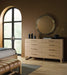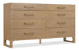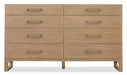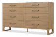 The Banyon Bay Eight Drawer Dresser offers ample storage and modern design. Made from white oak solids and oak veneers, it is finished in a light Desert Oak with wire-brushing and cerusing for added texture. The brushed brass stainless steel bar hardware adds a contemporary touch. With eight spacious drawers, including cedar-lined bottom drawers and a jewelry tray, this dresser provides ample storage for clothing and accessories. Its geometric lines and organic materials create a cohesive and casual look, perfect for any modern bedroom setting.